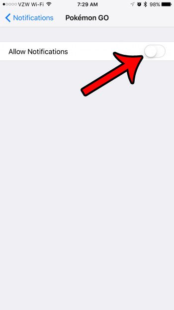 ステップ4:右側のボタンをタップします通知を許可しますそれらをすべてオフにします。すべての通知がオフになった場合、このメニューの残りのオプションは消えます。以下の写真では、ポケモンGO通知がオフになっています。