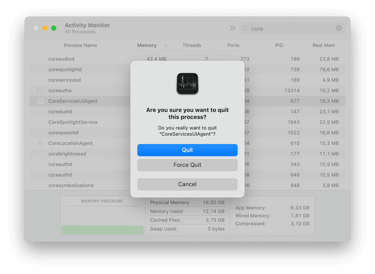 - アクティビティモニターを使用します。アプリケーション>ユーティリティに移動し、アクティビティモニターを開きます。検索ボックスを使用して、CoreServicesUiagentを検索します。見つけたら、それを選択して、ツールバーの「x」をクリックしてやめます。