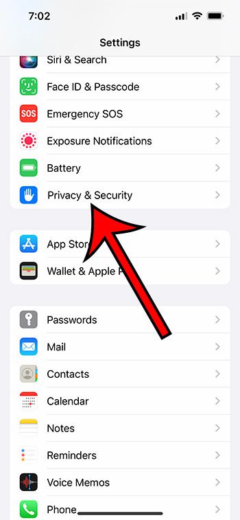ステップ2:下にスクロールして選択しますプライバシーとセキュリティメニューからオプション。