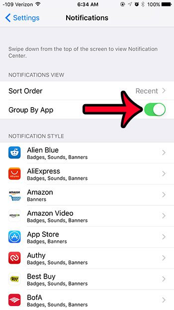 - 右側のボタンをタップしますグループごとのグループで通知ビュー画面の上部にあるセクション。ボタンの周りに緑色のシェーディングがあるときに設定がオンになります。下の画像でオンになっています。