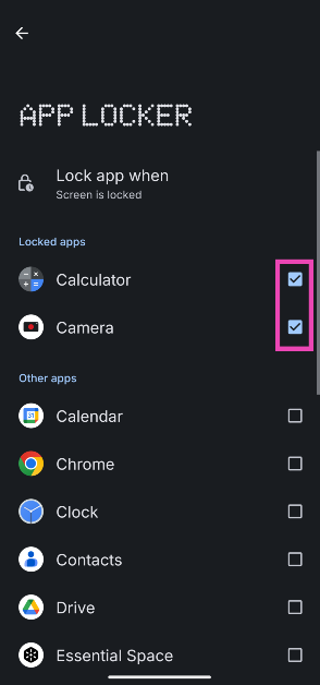 行きます設定>アプリ>アプリロッカー、ピンを入力し、ロックするアプリの横にあるチェックボックスを押します。
