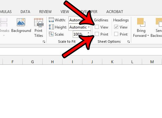 ステップ3:を見つけますグリッドラインのセクションシートオプションリボンのセクション。左側のボックスをクリックしますビュー左の箱印刷チェックマークを削除します。グリッドラインは、画面と印刷ページの両方に隠されており、以下の設定があります。