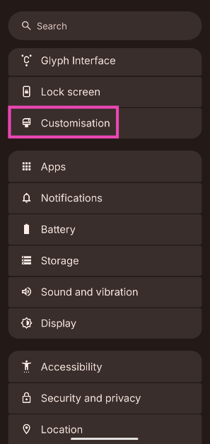 行きます設定>カスタマイズ>ホーム画面>アイコンパック「Nothing」をタップします。