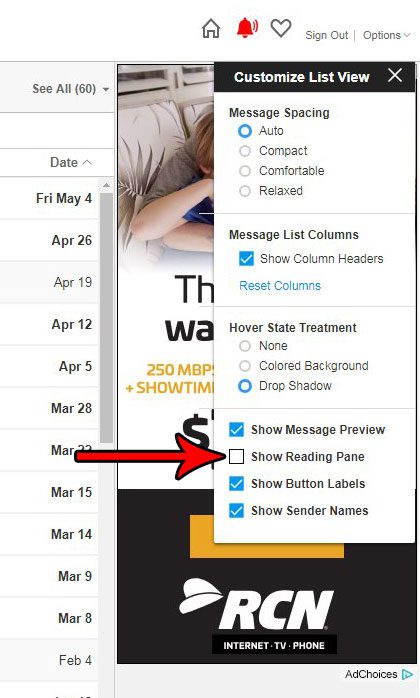 ステップ3:左側のボックスをクリックします読書ペインを表示しますチェックマークを削除します。受信トレイのレイアウトはすぐに変更されるはずです。これで、読み取りペインが以前にある場所の代わりに受信トレイがさらに表示されるようになりました。