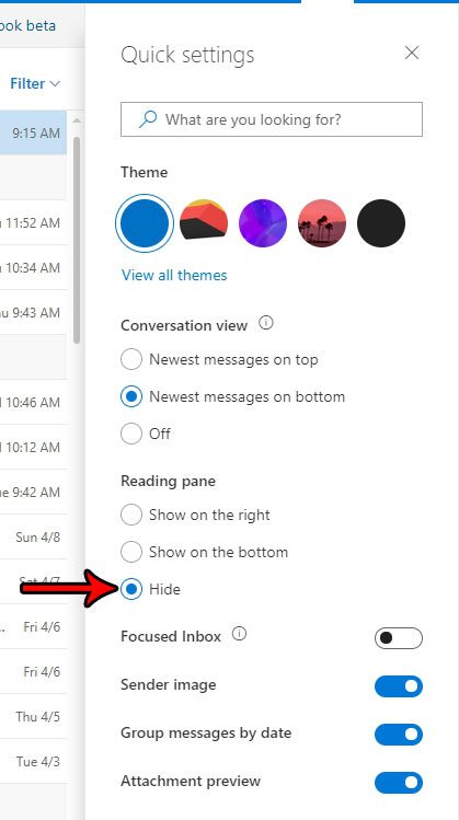 ステップ3:選択します隠れる下のオプションペインを読む。 Outlook.comの受信トレイの外観は、読み取りペインがなくなり、受信トレイがその場所を埋めるように変更する必要があります。