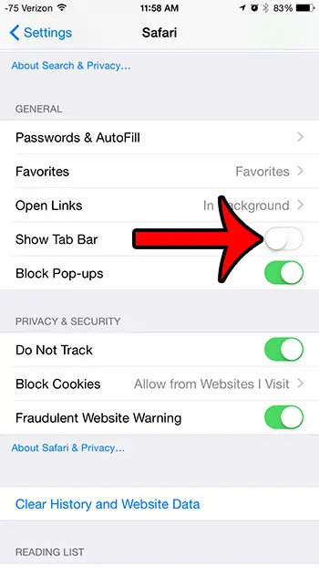 ステップ3:下にスクロールして、右側のボタンをタップしますタブバーを表示します。下の画像のように、ボタンの周りに緑色のシェーディングがない場合、オプションがオフになっていることがわかります。