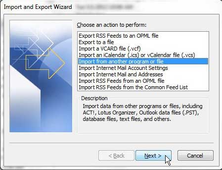 次に行うべきことは、クリックすることです輸入窓の中央にあるボタン、新しいものが開きますウィザードをインポートおよびエクスポートしますOutlookのウィンドウ。クリックします別のプログラムまたはファイルからインポートしますオプション、次にクリックします次ウィンドウの下部にあるボタン。