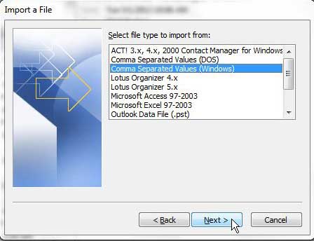 クリックしますコンマ分離値(Windows)オプション、次にクリックします次もう一度ボタン。