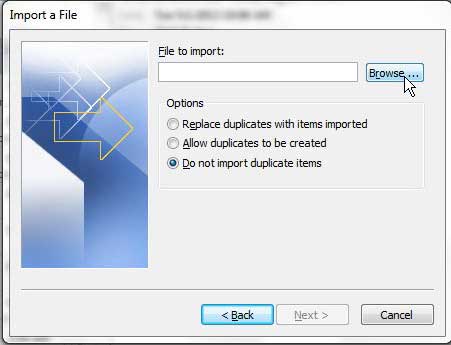 クリックしますブラウズウィンドウの上部にあるボタンは、Outlook2010にインポートするCSV Excelリストを見つけます。Outlookが遭遇する可能性のある重複した連絡先ファイルを処理するために使用するオプションを選択し、クリックしてからクリックします。次ボタン。