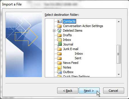 クリックします連絡先下のオプション宛先フォルダーを選択しますオプション、次にクリックします次もう一度ボタン。