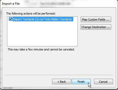 クリックします仕上げるボタンOutlook連絡先フォルダーにExcelリストをインポートするプロセスを完了します。