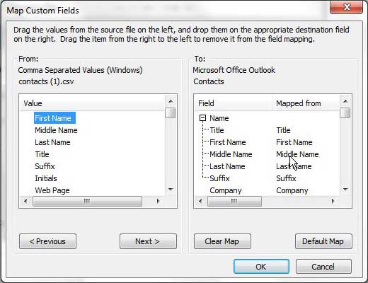 左の列から右列にドラッグして、Excelリストから適切なOutlookフィールドに適切なフィールドをマッピングする必要があります。