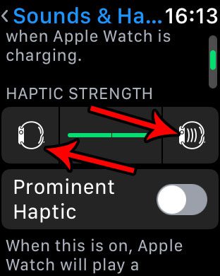 ステップ3:下にスクロールして、設定を触覚強度下で調整し、優先設定が見つかるまで調整します。緑色のラインの左側のボタンは、Apple Watchの触覚強度を低下させ、ラインの右側のボタンが増加します。