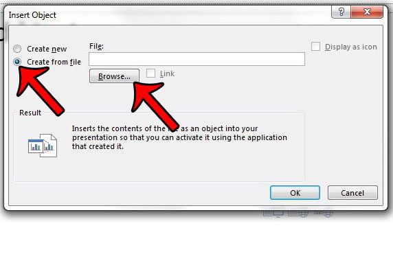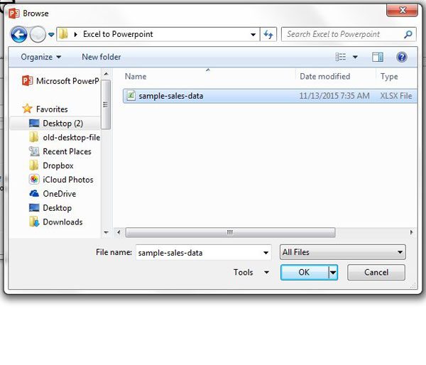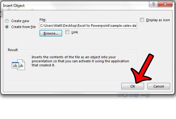 ステップ6:スライドショーに追加するExcelスプレッドシートを見つけてから、わかりましたボタン。