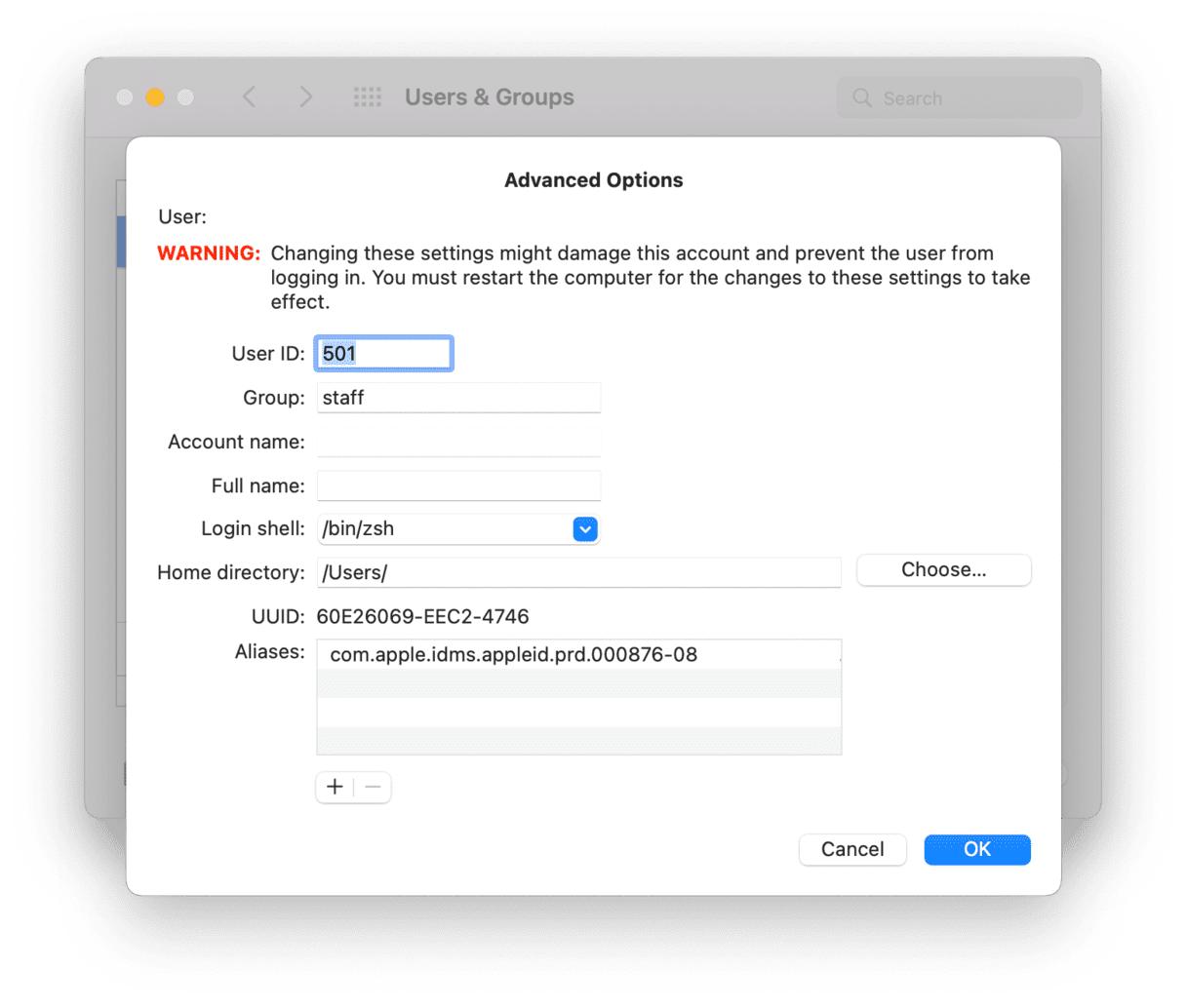 - 次の詳細を変更します:アカウント名、フルネーム、およびホームディレクトリ。