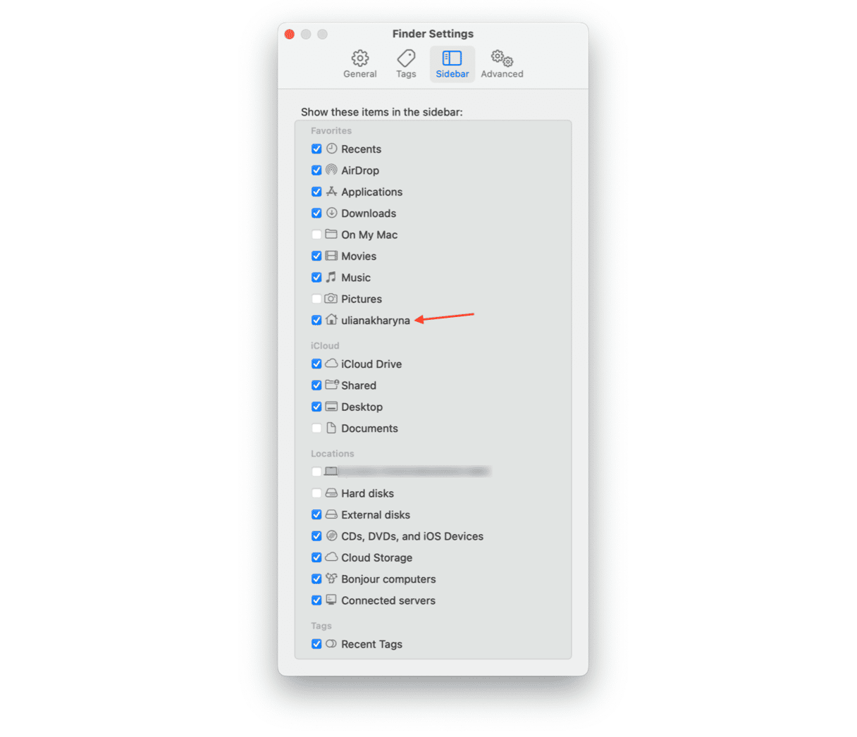 - [サイドバー]タブをクリックし、サイドバーに表示できるフォルダーのボックスを選択します。これには、家を含むことができます。ユーザーアカウントや家のように名前が付けられます。
