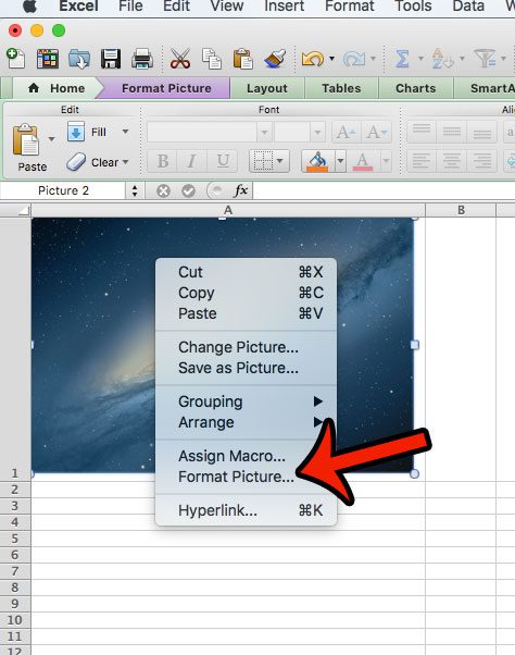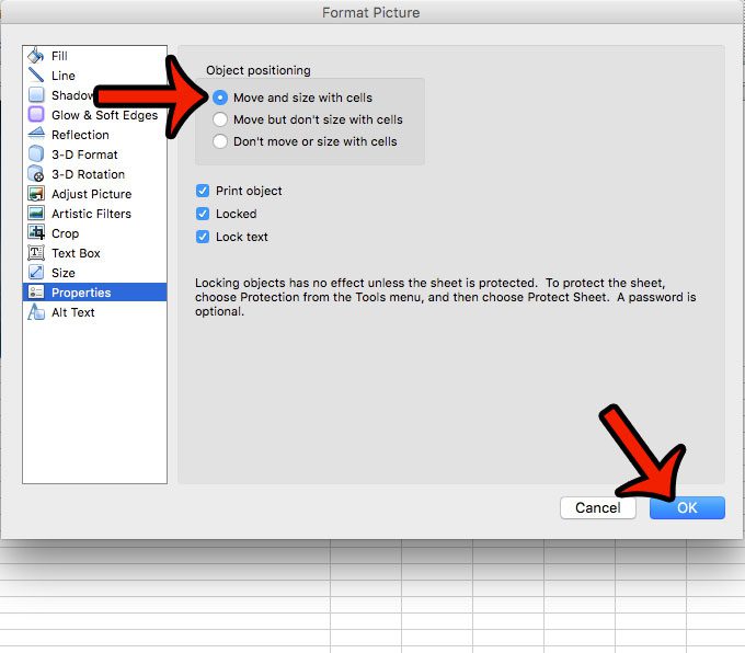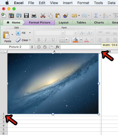幸いなことに、Excel 2011で写真をセルにロックすることでこの動作を調整できます。以下のガイドでは、この結果を達成するためにスプレッドシートの画像を変更する方法を示します。