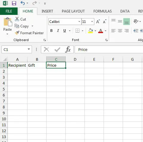 ステップ2:セルA1内をクリックし、「受信者」と入力し、セルB1内をクリックし、「ギフト」と入力し、セルC1内をクリックして「価格」と入力します。
