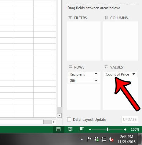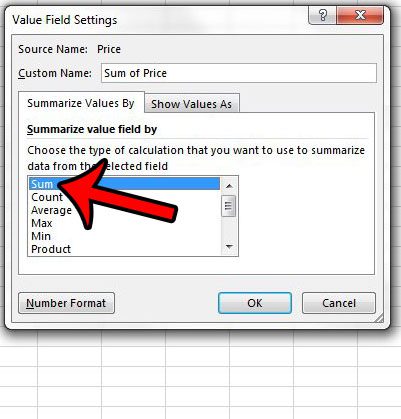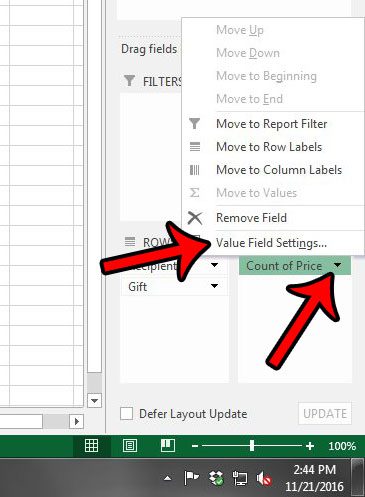 ステップ11:右側の矢印をクリックします価格の数、次にクリックします値フィールド設定オプション。