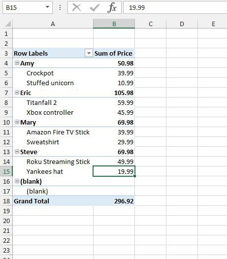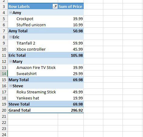 私のソリューションは3列のスプレッドシートで、ピボットテーブルを使用して要約します。ピボットテーブルは、その人のために購入したアイテムのリストと、セクションの下部に小計を使用して、各人のセクションにデータを整理します。ピボットテーブルは自動的に更新できます。そのため、プレゼントが追加される順序を心配する必要なく、購入を行う際にリストにアイテムを追加し続けることができます。