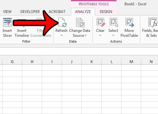 ピボットテーブルを更新することができます。リフレッシュしますのボタン分析しますタブの下ピボット可能なツール。ピボットテーブルのどこかをクリックしてピボット可能なツールタブが表示されます。