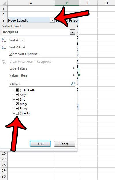 たとえば、テーブルから「空白」オプションを削除する場合は、右側の矢印をクリックできます。行ラベル、ブランクの左側のボックスをチェックしてから、クリックしますわかりましたボタン。