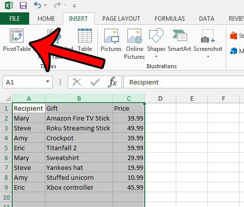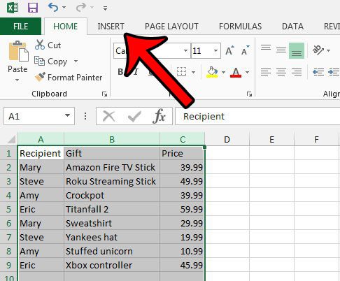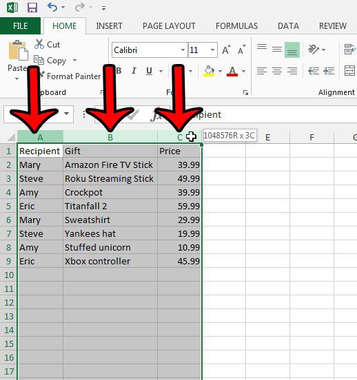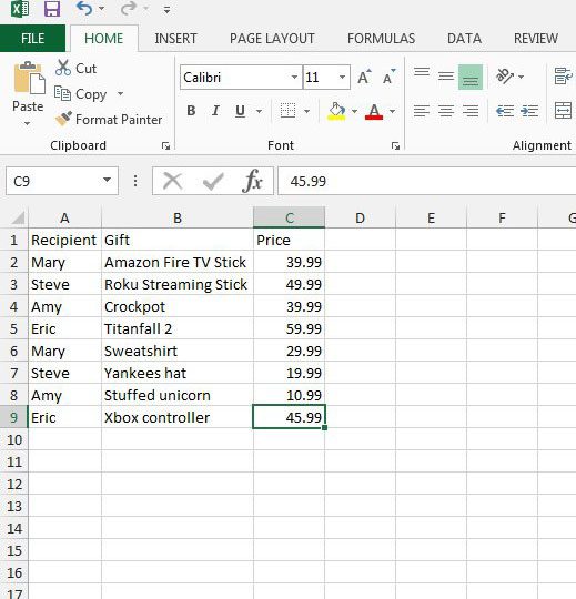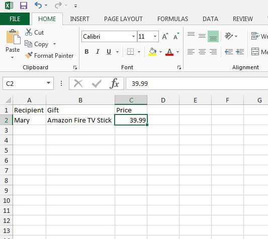 たとえば、あなたが持っている場合Amazon Fire TVスティック(Amazonリンク)メアリーという名前の人の場合、「メアリー」をセルA2に、「Amazon Fire TV Stick」にCell B2に、「39.99」にCell C2に入力することがあります。