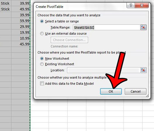 ステップ8:クリックしますわかりました下部のボタンPivottableを作成しますウィンドウ。