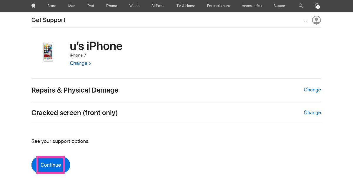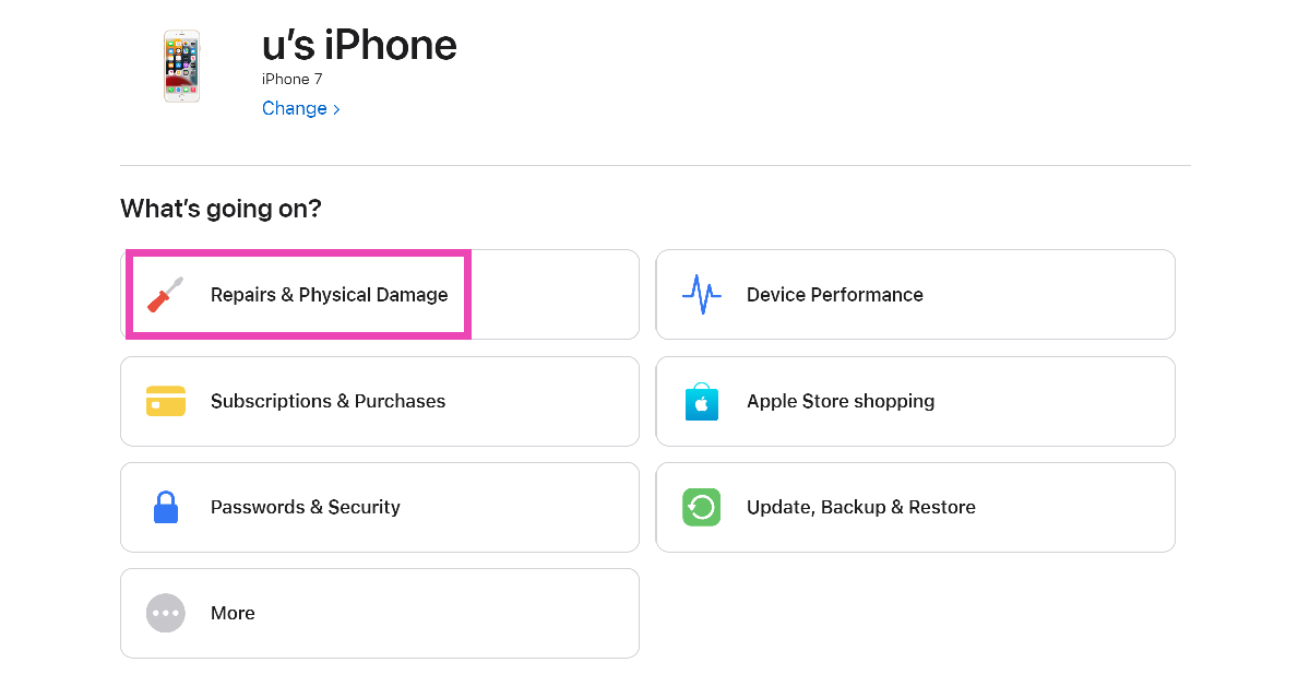 Appleサポートページに移動し、デバイスとそれに直面している問題を選択して、、訪問をスケジュールします。
