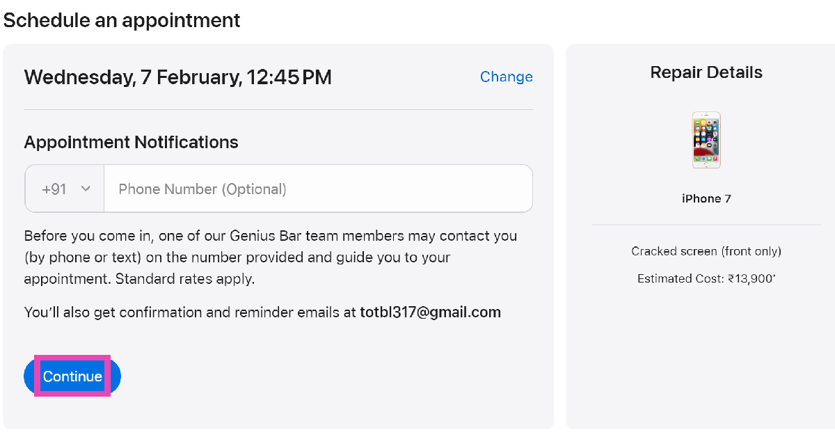 ステップ9:あなたはあなたを入力することができます電話番号予約通知を受信します。これは完全にオプションです。打つ続く。