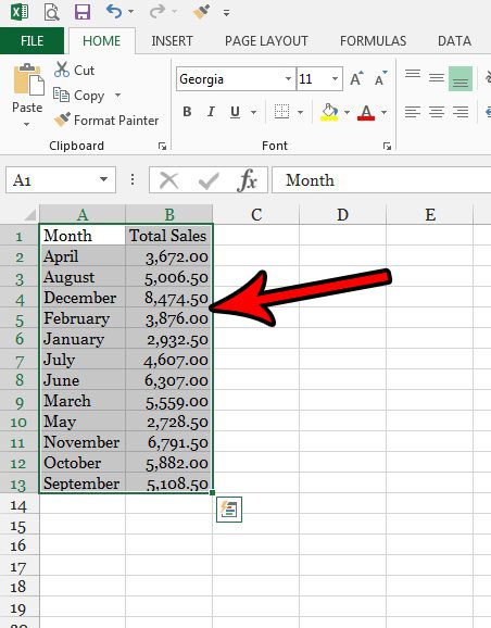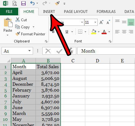 この記事の手順は、Microsoft Excel 2013で実行されました。このガイドでは、スプレッドシートにすでにデータがあり、そのデータをパイチャートとして表示することを想定しています。パイチャートにデータを最適に表示するには、2つの列があることが理想的です。パイの適切なサイズのピースとして表示されるデータを持つ1つの列、および1つの列。以下の私の例では、月の列とその月の総売上の列を含むパイチャートを表示します。