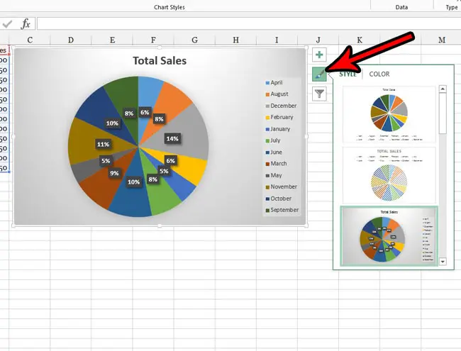 チャートの右側にあるペイントブラシツールをクリックすると、データを表示する方法については、他のいくつかのオプションが表示されます。たとえば、下の画像では、各パイスライスにオーバーレイされた合計の割合でデータを表示することを選択しました。