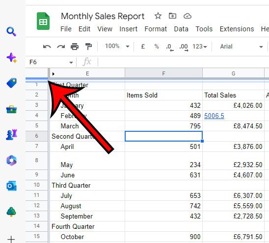 行を選択するには、ウィンドウの左側にある行番号をクリックします。同じアクションを使用して、シートの上部にある列文字をクリックして完全な列を選択できます。