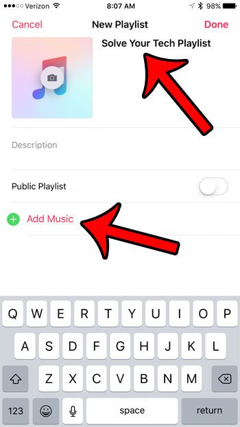 ステップ5:プレイリストに名前を付けて、緑をタップします音楽を追加しますボタン。