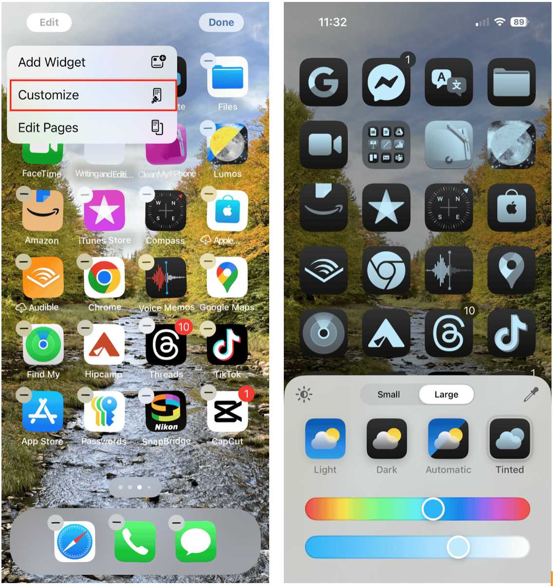 - 画面の下部にあるメニューから、使用可能なオプションから選択します。アイコンを大きくし、明るい、暗い、または着色された美学から選択し、選択した色の色合いを追加できます。