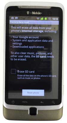 を押します電話をリセットしますボタン、次に選択しますすべてを消去しますオプション。パスワードを求められている場合は、パスワードを入力してOKを押します。電話がパスワードをリクエストしていて、パスワードを設定しなかった場合、デフォルトのパスワードを使用している場合があります。これは「1234」です。パスワードをもう一度確認してください。プロンプトが表示された場合は、もう一度OKを押して、Android T-Mobile G2のマスターリセットを完了します。