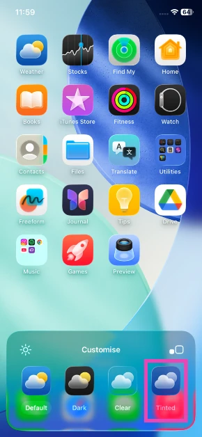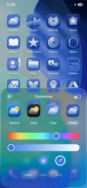 ホーム画面の空いている場所を長押しして、編集>カスタマイズ>色付き、iPhone のバックパネルのアイコンをタップし、テーマを選択し、ページ上の任意の場所をタップして変更を適用します。