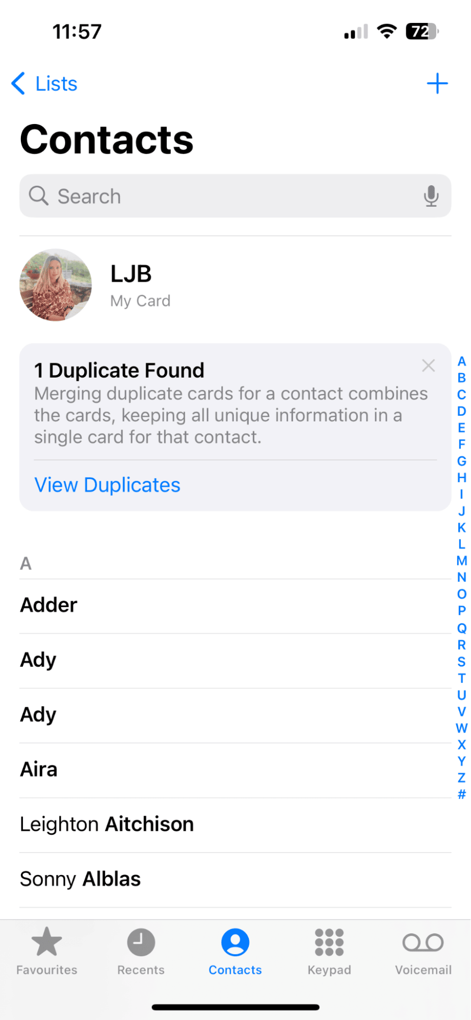 上部の「私のカード」に注意してください。連絡先が重複している場合は、ここにいくついるかが示されます。