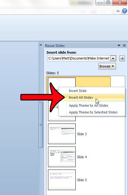 ステップ8:スライドの1つを右クリックしますスライドを再利用しますウィンドウの右側にある列、[すべてのスライドを挿入しますオプション。