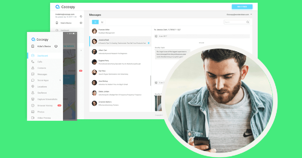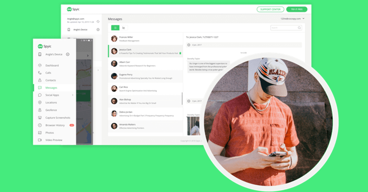 iOSおよびAndroidで利用可能、スパイシック監視アプリに期待するすべての重要な機能を提供します。ターゲットデバイスにインストールされたら、このアプリを使用して通話とテキストを追跡し、ジオフェンスパラメーターを設定し、インターネットブラウジング履歴のタブを維持できます。それ以外に、Spyicでは、WhatsApp、Snapchat、Instagram、Viberなどの主要なIMアプリを使用して送信されたメッセージを表示することもできます。 Spyicの基本的な月次計画は39.99ドルから始まります。