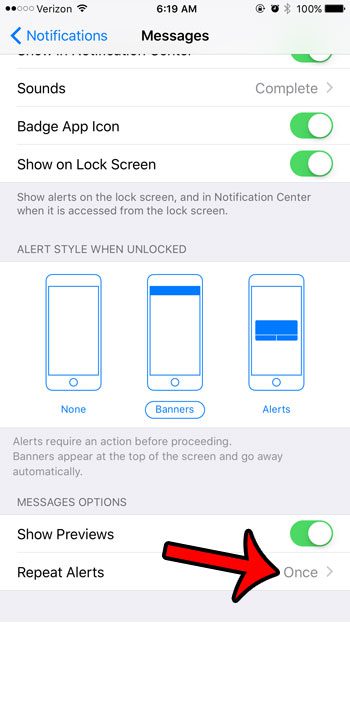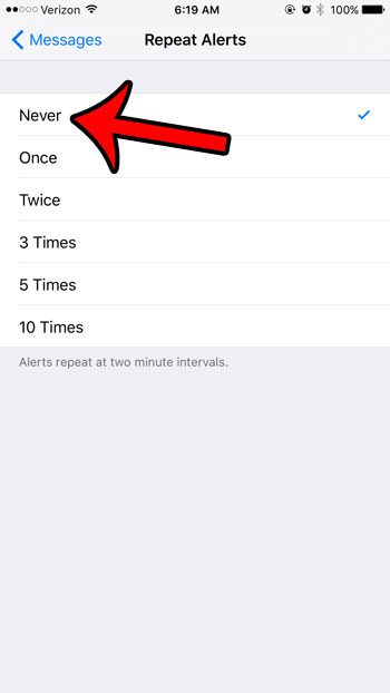 ステップ4:タップします一度もない画面の上部にあるオプションを使用して、iPhoneテキストメッセージを繰り返し停止するようにアラートを取得します。