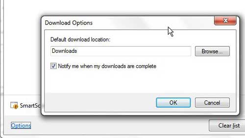 このウィンドウの最後のメモは、ダウンロードしたファイルが保存されているフォルダーを変更する機能です。クリックしますオプションダウンロードウィンドウの左下隅にリンクし、クリックしますブラウズウィンドウの右側にあるボタンは、将来のダウンロードされたファイルのために目的の場所を選択します。