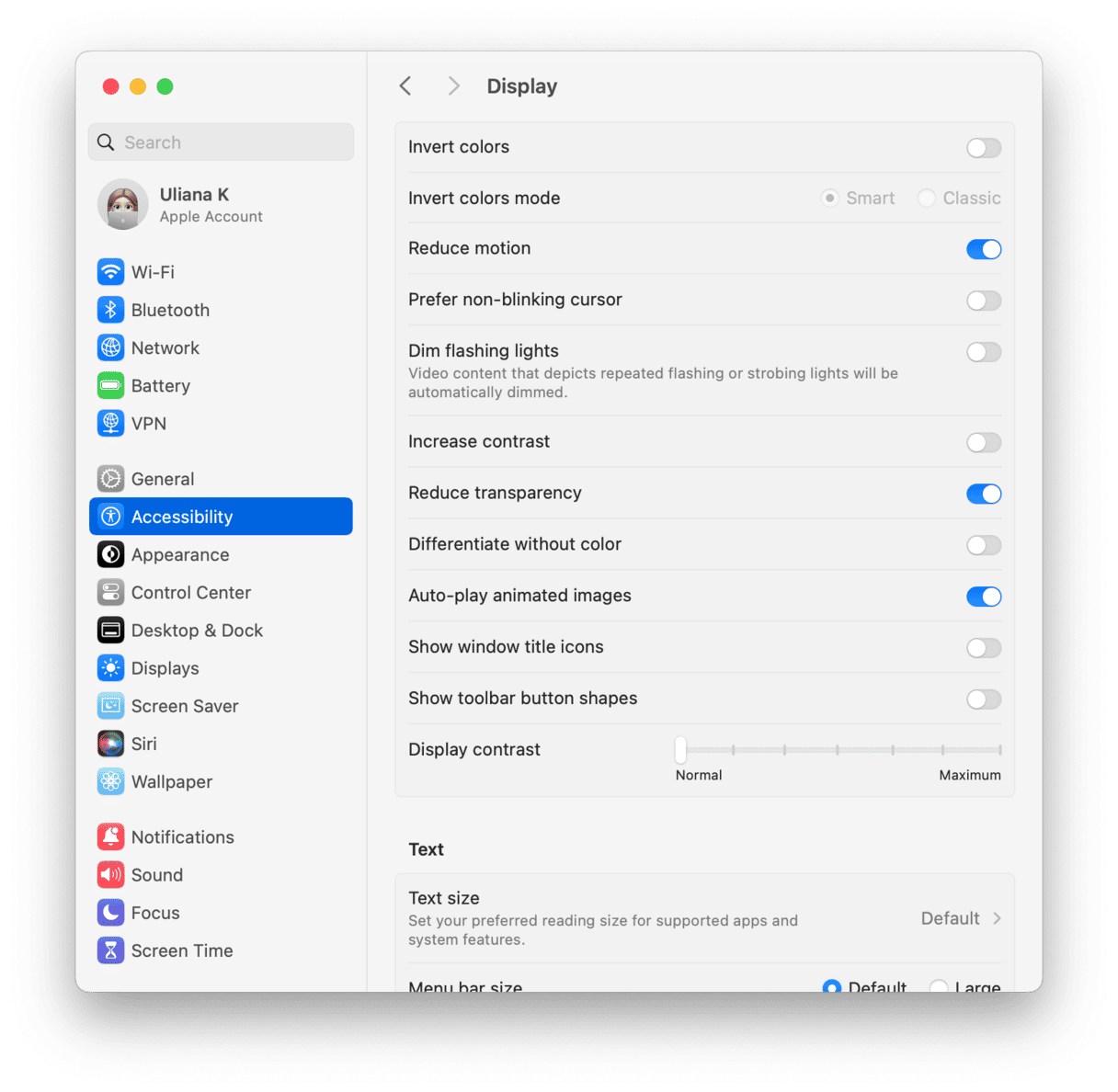 - ディスプレイセクションでは、動きを減らし、透明性を低下させます。