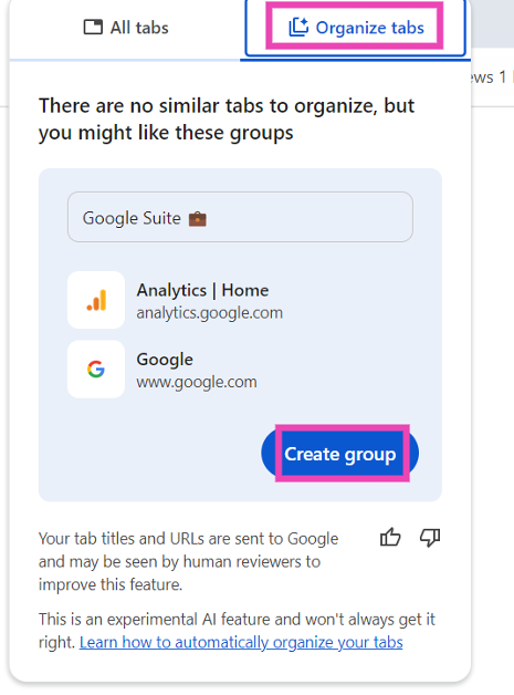 Chrome用の実験的なGoogle AIは、オープンタブを分析し、それらにグループ化の提案を提供します。たとえば、あなたが働いていて、食べ物のレシピや近くのレストランを同時に見ている場合、仕事、レシピ、レストランの3つのグループを作成します。ブラウザの開いたタブは、関連するグループに割り当てられます。これらのグループは、アクセスを容易にするために色分けされています。