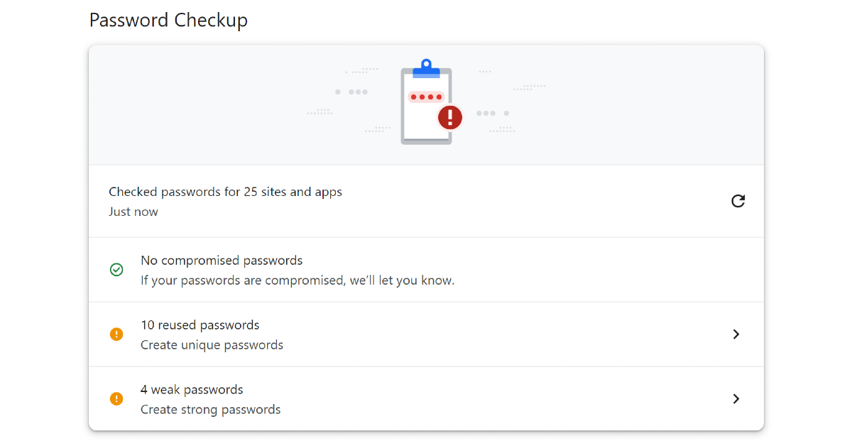 弱いパスワード:「1234」、「ABCD」、「パスワード」などのパスワードは、推測してクラックしやすい弱いパスワードとして分類されます。 Google Password Managerを使用すると、どの保存されたパスワードが弱く、強化する必要があるかを知ることができます。