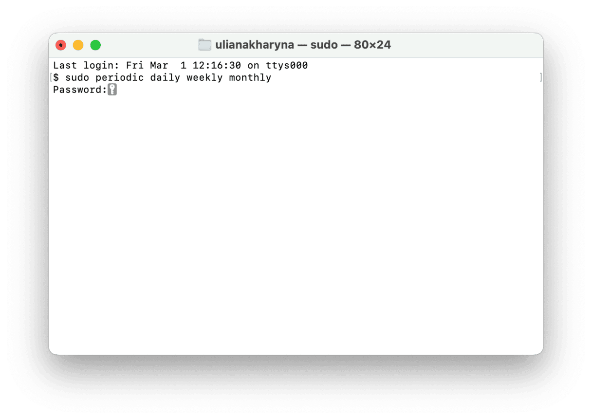 sudo periodic daily weekly monthlyreturnを押します。 - 管理者のパスワードを入力するように求められます。セキュリティ上の理由から、パスワードは画面に表示されません。