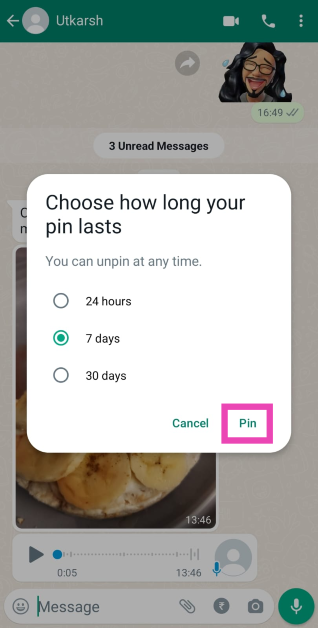 いいえ、WhatsAppを使用すると、24時間7日間、または30日間メッセージをピン留めできます。