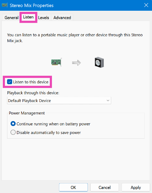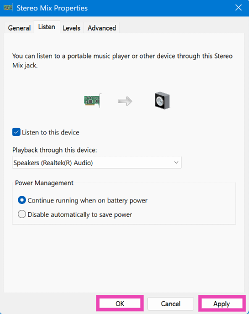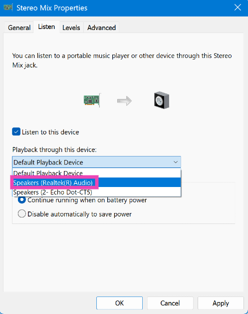 行きます設定>システム>サウンドプライマリオーディオデバイスを選択します。次に、に行きますその他のサウンド設定>録音、ステレオミックスを右クリックして有効にします。ステレオミックスをもう一度右クリックして、デフォルトのデバイスとして設定します。次に、ステレオミックスをダブルクリックして、リスニングタブに移動します。 [このデバイスを聞く]を選択し、ドロップダウンメニューを押して、セカンダリスピーカーを選択します。適用してOKを押してください。
