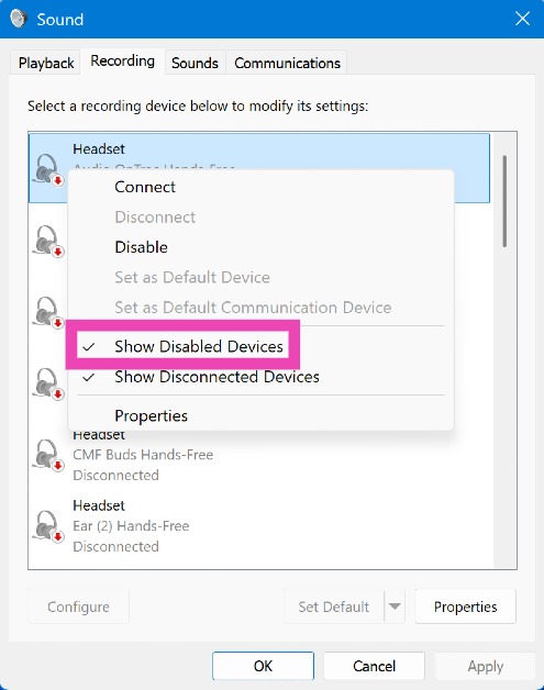 ステップ5:に切り替えます録音タブ。任意のデバイスを右クリックして確認してください無効なデバイスを表示します'選択されます。