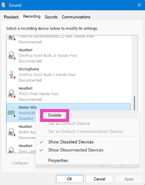 ステップ6:下にスクロールして右クリックしますステレオミックス。選択します有効にする。